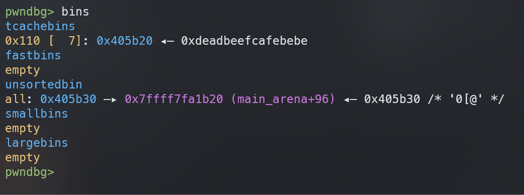 이 상태에서 tcache를 하나 비우고 target을 해제하면, target이 tcache로 들어가게 되면서 서로 다른 bin에 duplication된 상태가 된다.