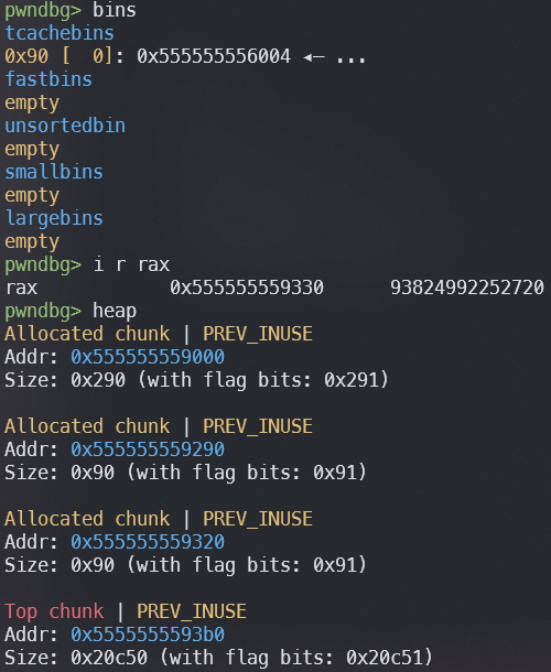 위와 같이 tcache에 청크가 있음에도 불구하고 tcache에서 할당받지 않고 완전히 새로운 영역에서 할당받았음을 알 수 있다. 이는 glibc-2.30에 도입된 보호기법 때문이다.